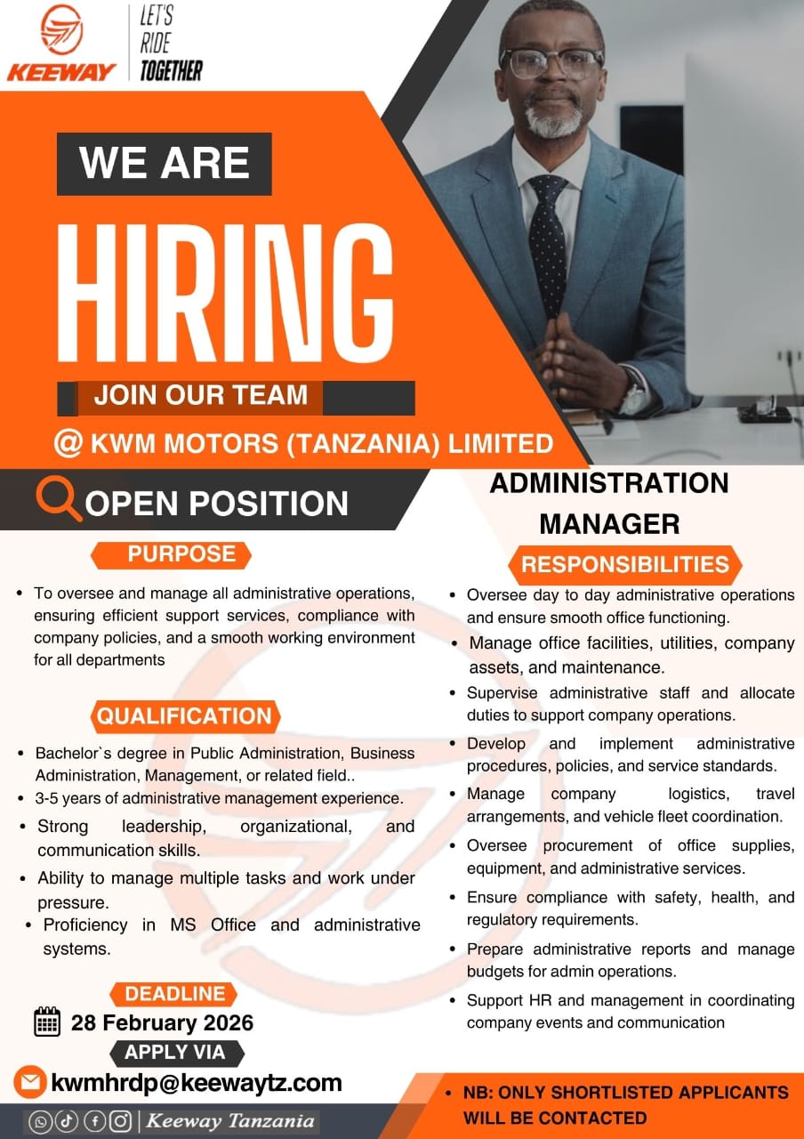 Administration Manager at KWM Motors Tanzania Ltd February 2026